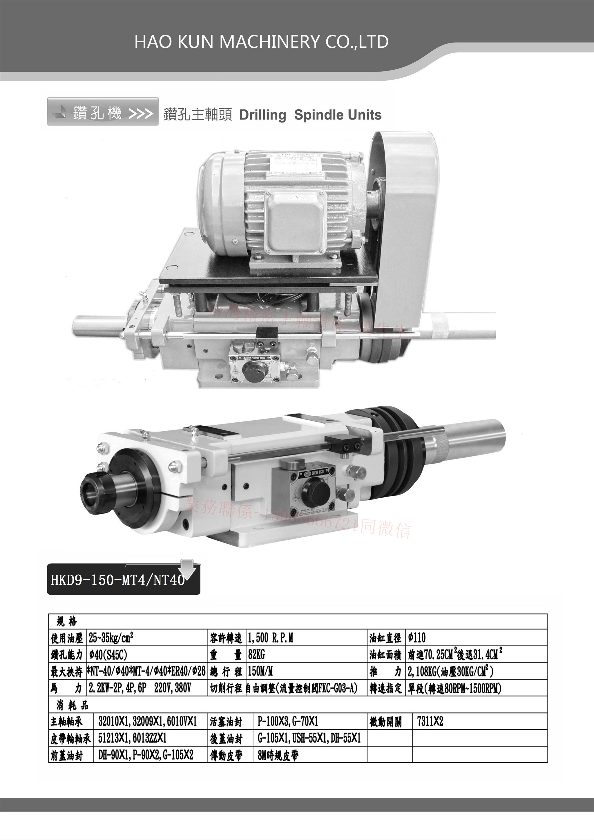 HKD9-150油压(钻孔能力為(S45C) ∮40mm,主轴转速為RPM1500,主轴X行程為150mm,马力為5HP*2P/4P/6P,鼻端输出方式為NT40/AS32/MT4/ER40,重量為90Kg).