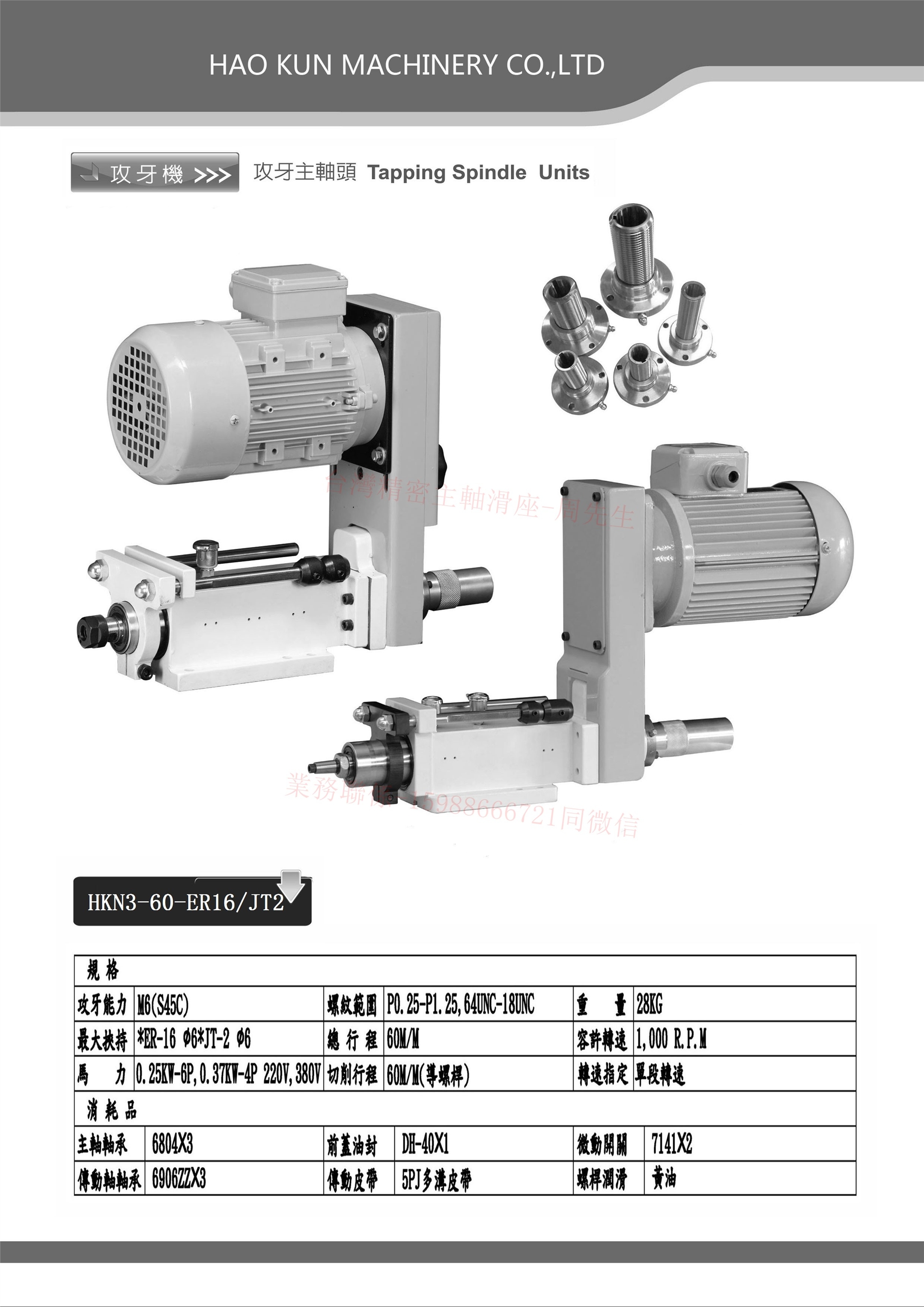 N3-60M-ER16,攻牙能力M6以内(以S45C为标准),行程60mm,牙规的牙距根据客户所需加工孔的牙距定制,主轴真圆度0.005mm以内,温升20度以内。