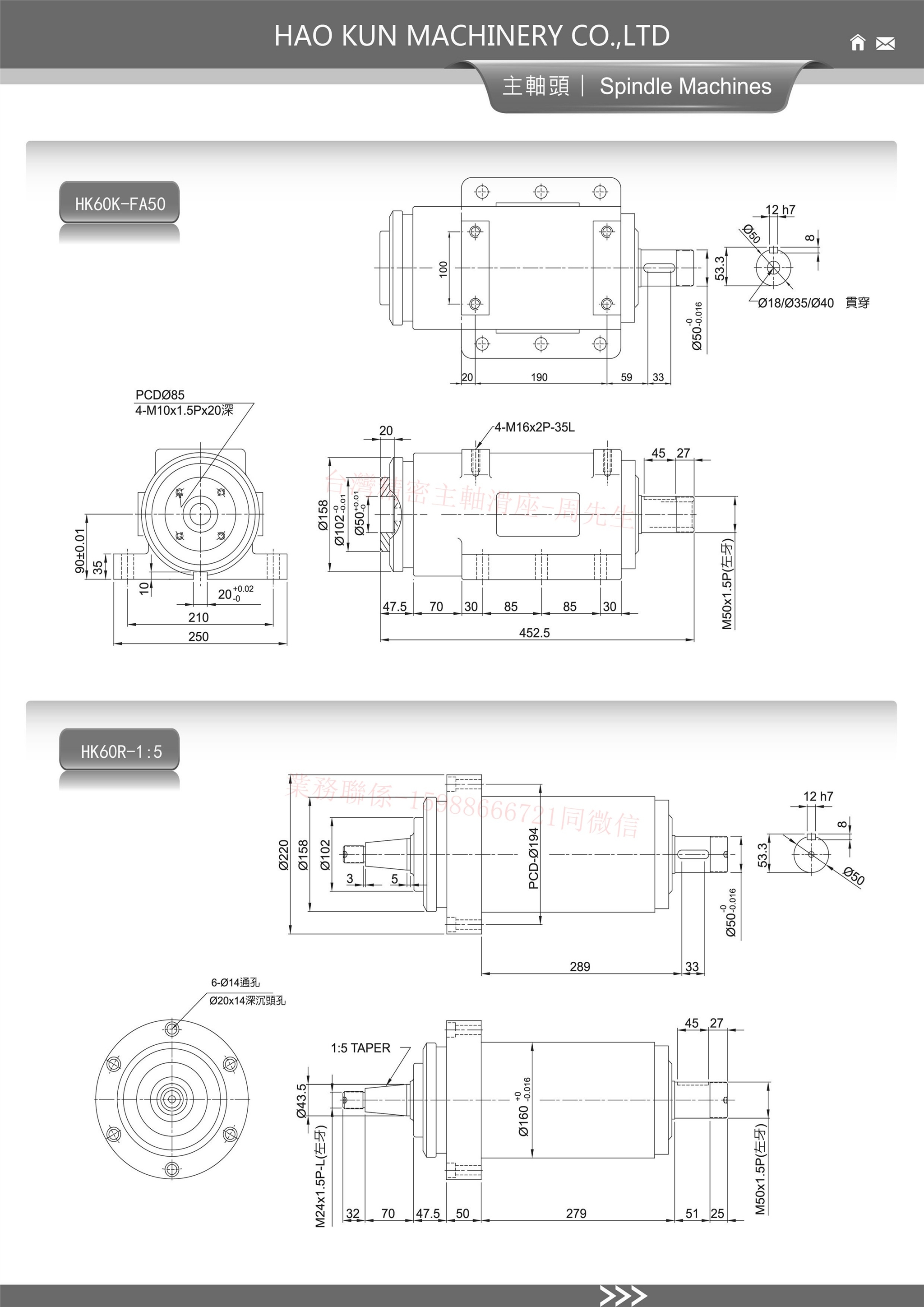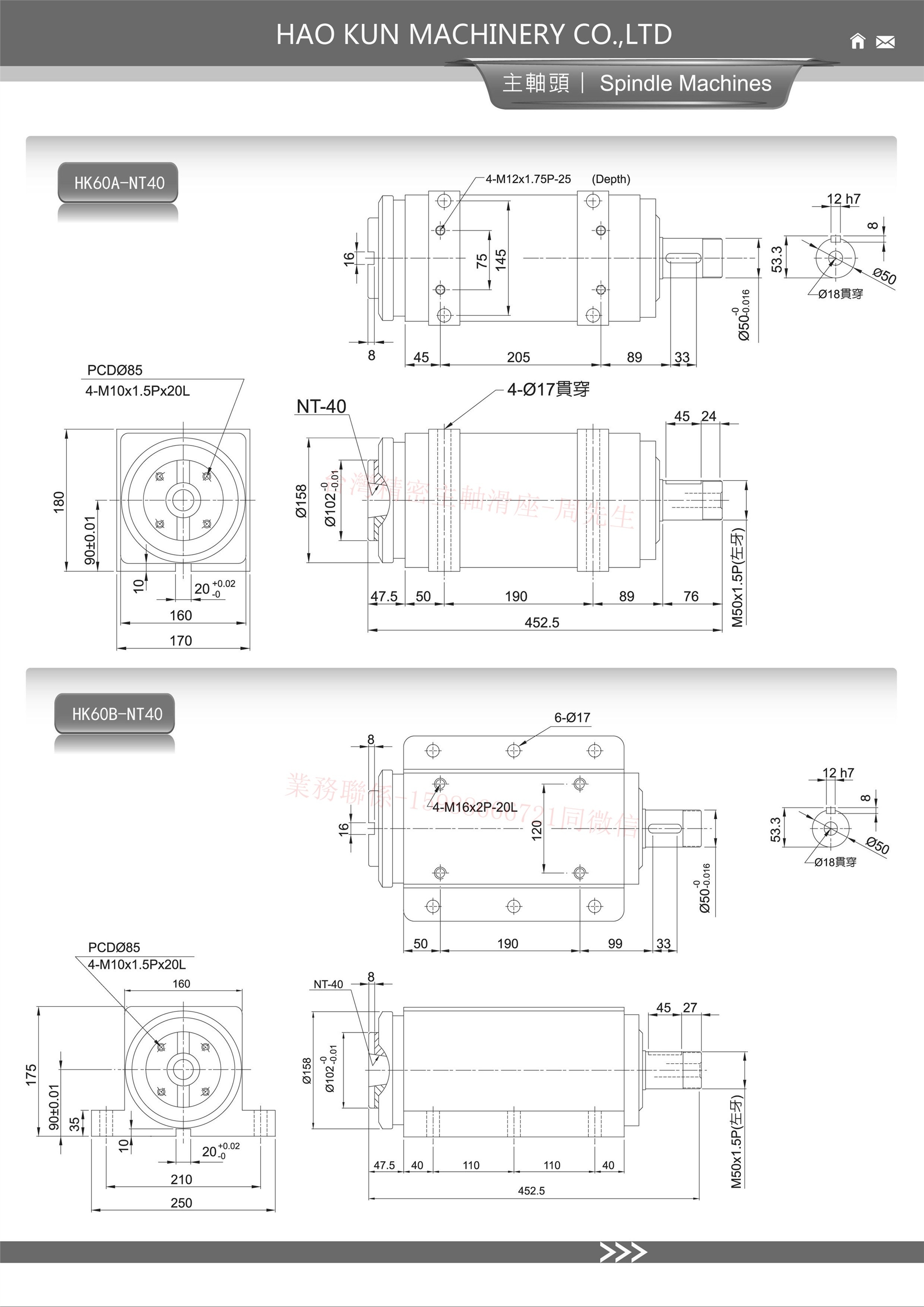 HK60-NT40/FA50,容许转速1700RPM,温升为20°C,容许马力为3.7KW(5HP),主轴真圆度跳动0.0050.002mm,重量60KG.