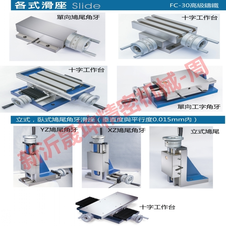 立式鸠尾滑座:材质为FC-30铸铁,平行度和直角度0.03mm内,滑动面经过热处理及精密研磨加工。STD-100台面尺寸100mm*150mm,底座高255mm;  STD-130台面尺寸130mm*165mm,底座高265mm;  STD-150台面尺寸150mm*200mm,底座高385mm;  STD-200台面尺寸200mm*250mm,底座高510mm;  STD-2075台面尺寸200mm*250mm,底座高750mm;  STD-250台面尺寸250mm*300mm,底座高600mm;