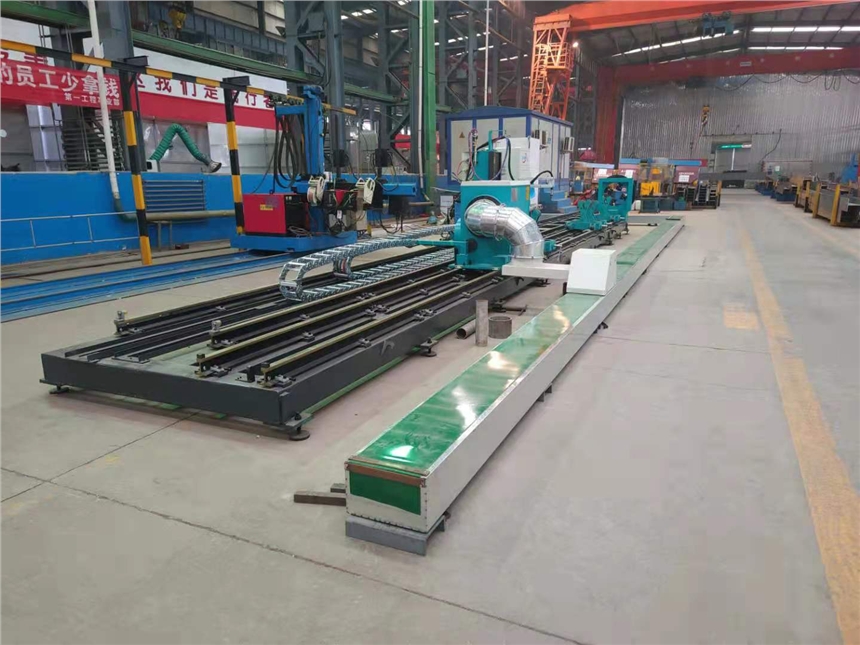 八轴相贯线切割机整机分成三节含底盘。我们的这款设备主要客户群体是钢结构行业,这种结构对工地在外面的钢结构企业的运输和安装,八轴相贯线切割机的底盘经铣床铣过,保障了运行精度。使用等离子进行切割,一般配备海宝和林肯的电源,主要还要根据需要来定制电源大小。软件自主研发,有管件拆分,镜像功能,报错功能,自动优化相贯口型,支持第三方软件,tekla,3D3S,CAD,solidworks。tekla的对接我们可以直接读取他的建模,支持程序批量转换输出,长度优化套料,将图纸导入系统后然后根据同管径同壁厚厚度进行计算,然后设计出切割方案,先将短工件进行套料切割,然后将长的放到后面切割,减少工件的拆分,减少后期焊工的工作量,提高生产效率。扭转套料,可以将口型和口型对接调料,节省原材料。反向计算,输入管件的尺寸,计算出原材料使用长度,然后再向钢管厂进料进货.节省生产成本