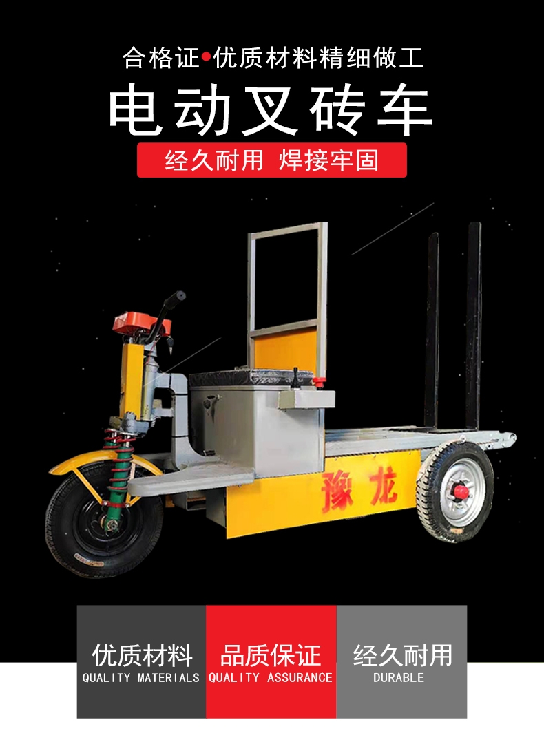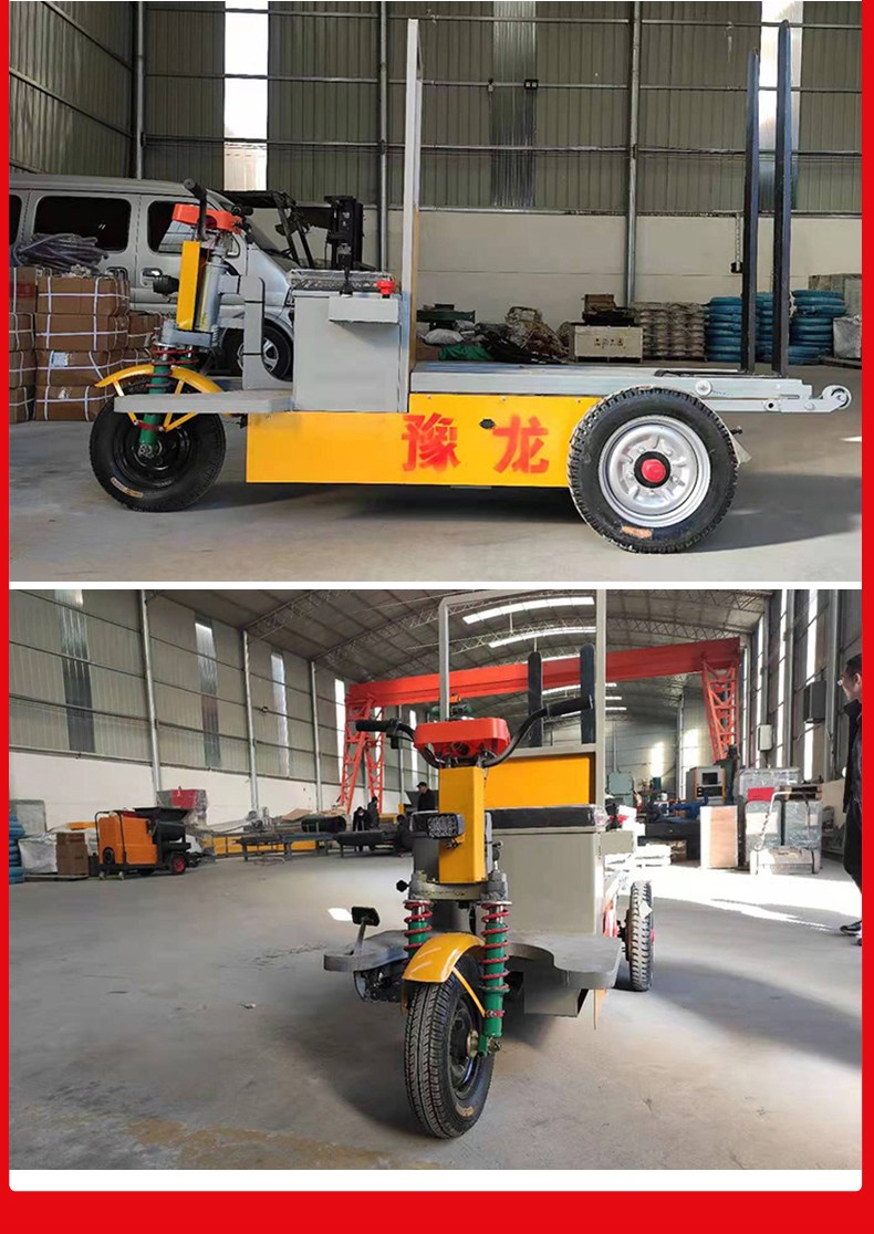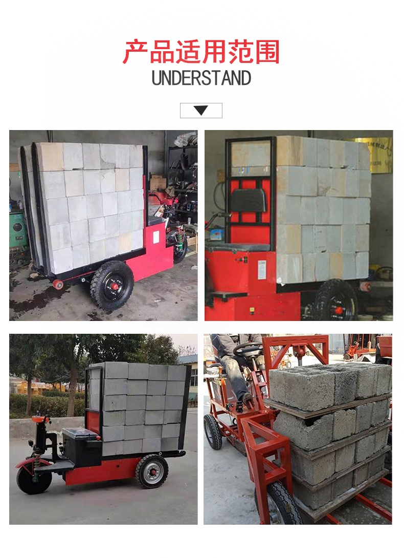 水泥砖电瓶叉砖车采用无级调速、自动倒车、智能充电、刹车断电,平稳、节能、无污染、无噪音,手把转向,转弯半径小,操作简单,行驶安全可靠. 工地用的电瓶拉砖车砖厂专用