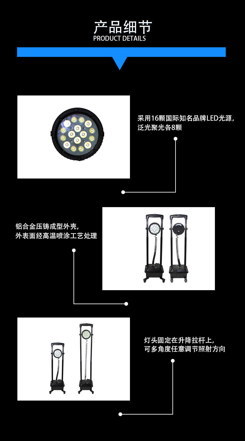 ◆使用方便: 灯头固定在升降拉杆上,可多角度任意调节照射方向,支持0.85~1.5米高度内任意升降;升降拉杆和电池箱为一体式结构,箱体底部装有方便移动的轮子,可方便托行。