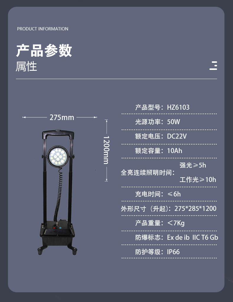 本公司结合市场需要研制开发的HZ6103防爆强光工作灯,主要适用于炼油、化工、油田等易燃易爆场所小范围施工、检修、抢险应急照明。