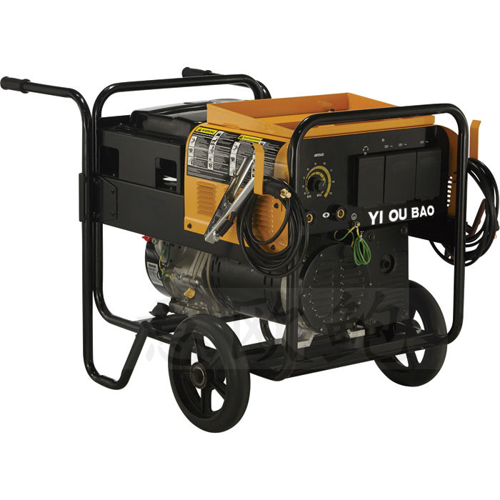 柴油发电电焊两用机是将柴油 发电机和电焊机有机的融合在一起的一种机械产品。其主要特点是:结构紧凑、重量轻、携带方便、启动简单等。柴油发电电焊两用机还配有交流电输出,可以作为普通电源使用。意欧鲍动力发电电焊机易操作性,轻便和简洁的设计改进了机器的现场操作性,并且节省了大量的储存空间,同时四个持久耐用的车轮更便于运输。意欧鲍发电焊机重量轻,便携式,手推式,功率大,无需固定电源,应用广泛 可适用于不同的焊条直径和焊接环境。电机和电焊机好结合,具有动力启动快捷、运转平稳、震动小、油耗省、体积小、结构紧凑、点火稳定可靠等优点。我们提供一年质保,终身维护,一年之内,电机和动力出现任何质量上的问题,我们将为您提供免费维修或更换,运费也是我们承担,一直以来希图发电机较低的返修率是我们优秀品质好的说服力。