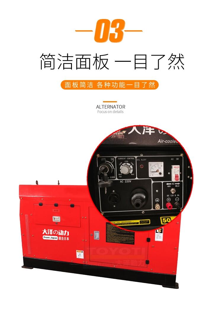 大泽500A柴油发电电焊机大泽发电焊机重量轻,便携式,手推式,功率大,无需固定电源,此款产品的问世对那些经常野外作业、用电不便、山上施工、开发乡里、管道电焊、停电应急电焊、工程施工等用户使用。