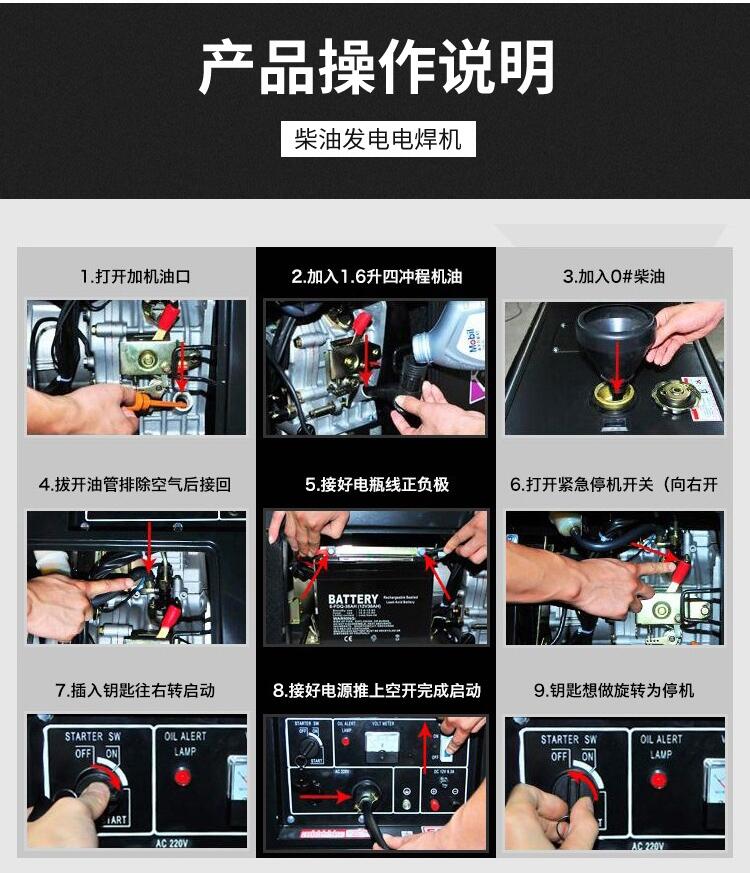 宁可自己麻烦十分,不让客户为难一时。大泽动力发电电焊机启动方式分为手、电启动,对于电焊机而言,相信做户外工程、建筑工程以及常年在野外施工的朋友们来说一点都不陌生,因为这是他们工作的必备品,电焊机顾名思义就是需要用电的焊机,而在野外没有电源怎么办呢?那就找发电电焊机,用一种能源提供给电焊机,不需要插电,那就是柴油、汽油等资源。大泽动力发电电焊机,采用中频(50Hz)使焊接电流稳定,焊接效果好,飞溅小,焊接成型美观;辅助电源直流220V、380V/5kw,采用电阻控制励磁来调节焊接电流,故障率更低,负载持续率高可以连续焊接作业,是为专业焊接生产的焊机。适用范围:该产品重量轻、体积小、移动方便,负载持续率高,外型设计特别,广泛适应于机械制造、天然气/自来水管道、铁路、石油管道、电建、化工及建筑等行业的野外施工、抢修、高空作业的长时间使用。此款机器可以联系使用 20小时。机器便携体重102KG。