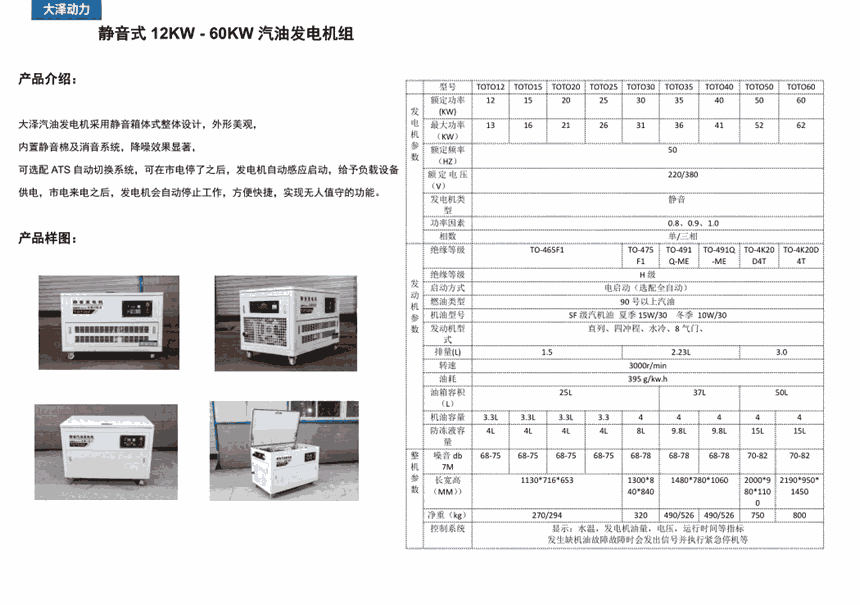 大泽动力大泽发电机采用四缸风冷四冲程汽油机为动力,具有马力足、结构设计先进合理、持久耐用、便于维护等特点,该系列发电机组感性负载好,稳态及动态过程电压。