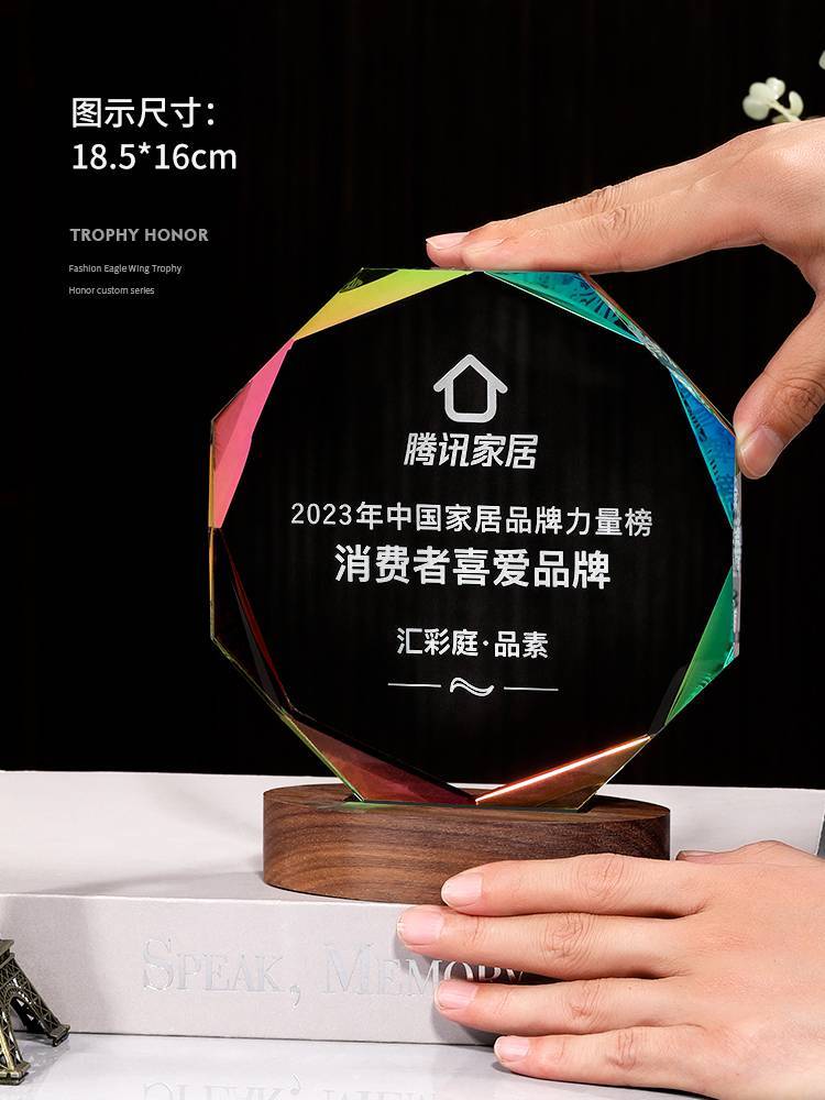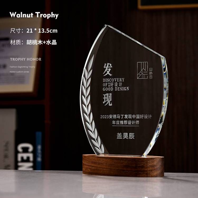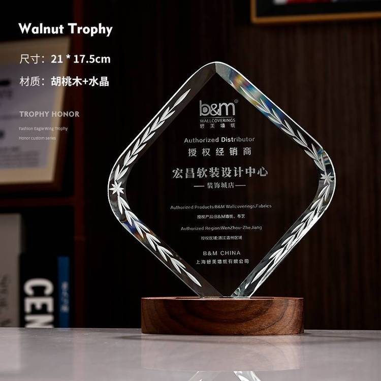 ? ? ?胡桃木底座奖杯,顾名思议,就是用胡桃木作底座的玻璃奖杯,木底座上可以用激光雕刻文字,也可以用UV印刷文字和图案,玻璃奖杯一周有刻花的,也有不刻花的,造形多样,品种丰富,玻璃奖杯上可认雕刻文字,也可以把文字和LOGO做成不同的颜色,还可以在奖杯里面用激光雕刻白色的文字或者图案,想要了解更多的工艺祥情请联系13802523292.