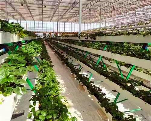 立体栽培分层利用空间,植株光照充足,生长健壮,果实着色均匀,商品果率可达90%以上。草莓全部生长悬挂在种植槽外,整齐美观。草莓种植在距地面0.6米和1.2米高的种植槽中,不用弯腰便可以摘到草莓。立体栽培的草莓,颜色鲜亮、口感好、洁净卫生、采摘方便,适合发展观光农业。