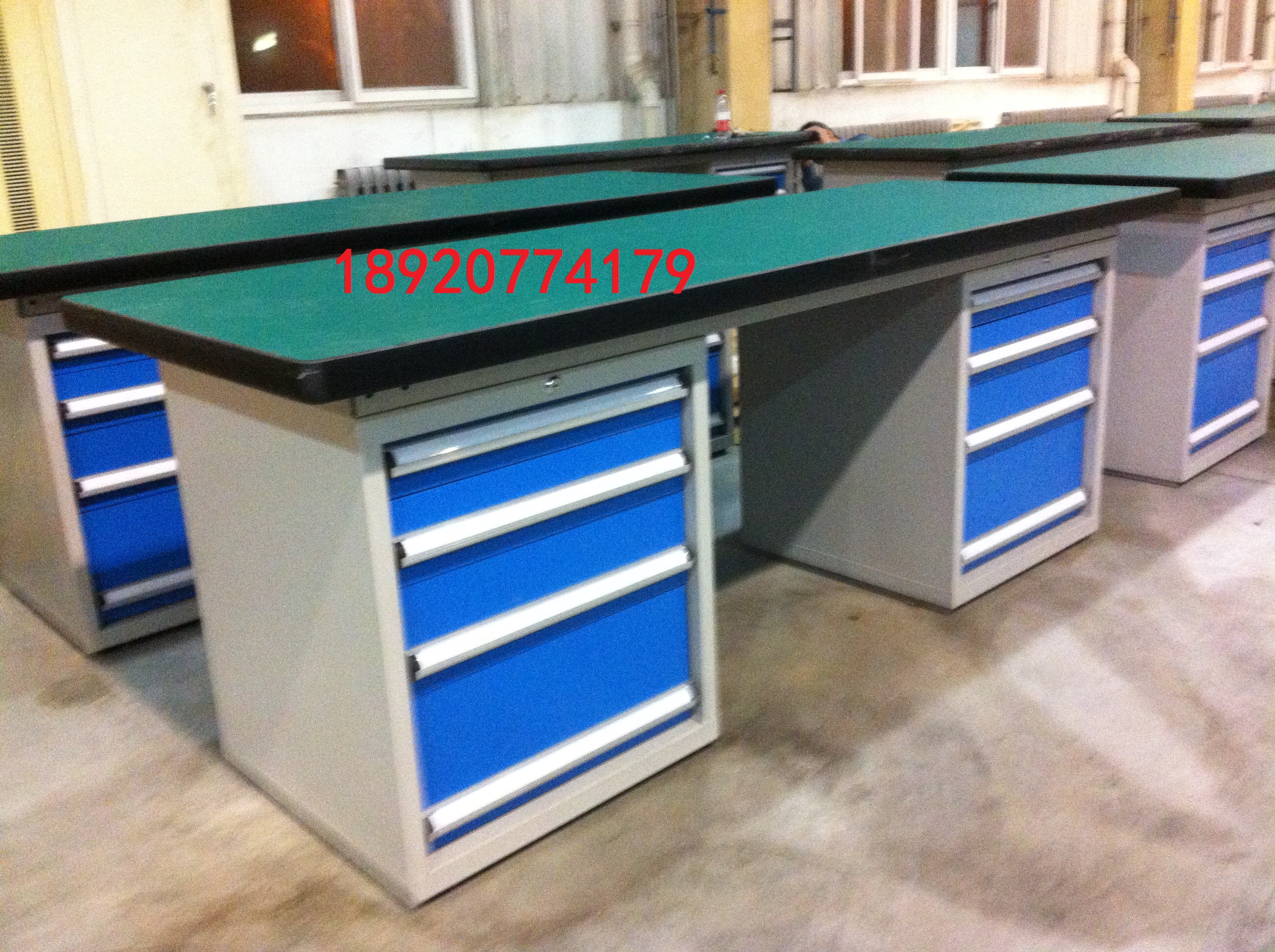 台面采用高密度复合板,表面平铺6~~10mm铁板,采用焊接、螺栓等机械连接钢板。强度高、抗冲击性强,耐磨耐用,使用寿命长,可装配台虎钳; |