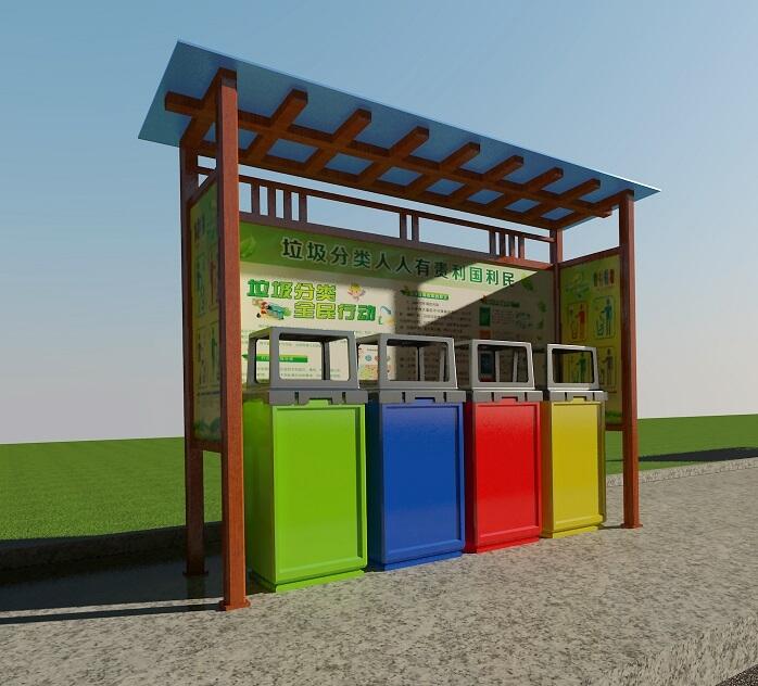 目前,生活垃圾分类收集是城市生活垃圾处置的主流趋势,也是现代城市文明进步的标志之一,有利于提升垃圾清运效率,便于再生资源的回收利用,减少环境污染,缓解环卫工人常规保洁的压力。垃圾分类亭,分为地基基础设施、公益宣传栏、立柱、顶棚等,亭内设置可回收、有害垃圾、厨房垃圾和其他垃圾等垃圾桶,垃圾桶及宣传栏配有垃圾分类的宣传标语,广大群众可以根据垃圾桶的提示标语,将废弃的生活垃圾投放到对应的垃圾桶中。