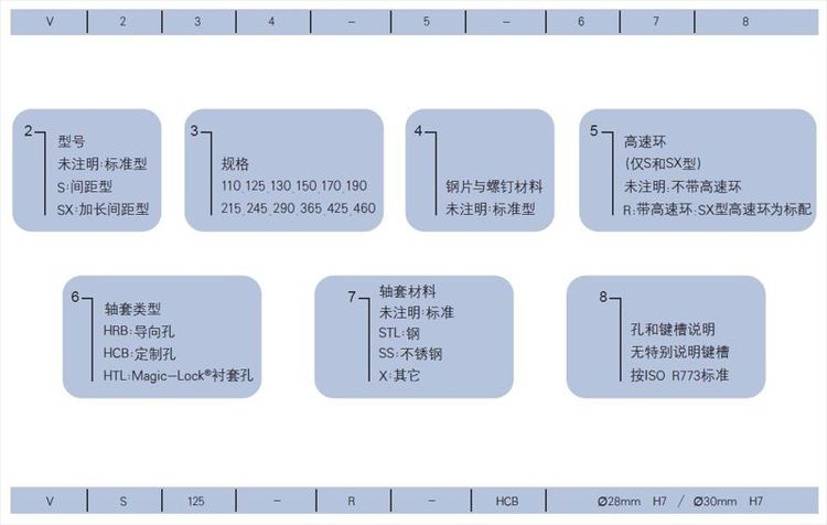 ? ?莱克斯诺Viva?间距型联轴器,规格125,带螺钉、高速环,标准轴套定制孔径?28mm公差H7和?30mm公差H7,ISO R773标准键槽。Magic-Lock?为锥套生产商的注册商标,可与Taper-Lock?锥套互换。Taper-Lock?为Reliance Electric公司注册商标。