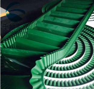 裙边输送带分为:有裙边无隔板输送带和有裙边有隔板输送带两种。能使各种散装物料以0-90度作任意倾角连续输送、具有输送倾角大、使用范围广、占地面积小。无转运点、减少土建投资、维护费用低、输送量大等特点,解决了普通输送带或花纹输送带所不能达到的输送角度。波状挡边输送带可根据要求设计成一套完整输送系统,避免了间断输送和复杂输送的提升系统。