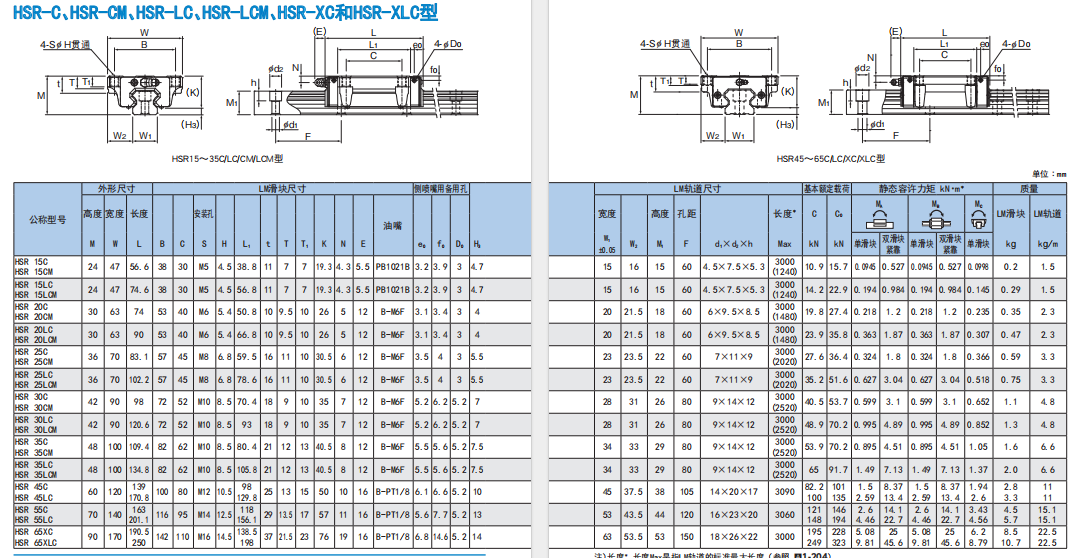 钢球沿着LM轨道和LM滑块上经过精密研磨加工的4列滚动面进行滚动;通过组装在LM滑块上的端盖板,使钢球列循环运动。LM滑块采用保持板将钢球保持住,因此即使从LM轨道中抽出LM滑块,钢球也不会脱落(HSR8、10和12型除外)。为使LM滑块上的4个作用方向(径向、反径向和侧向)均具有相同的额定载荷,各钢球列被设计成按接触角45°配置,无论何种姿势都可以使用。因能施加均等的预压,从而保持较低摩擦系数的同时,又提高了4个方向的刚性。因断面高度低,并且对LM滑块进行了高刚性设计,从而能获得稳定的高精度直线运动。