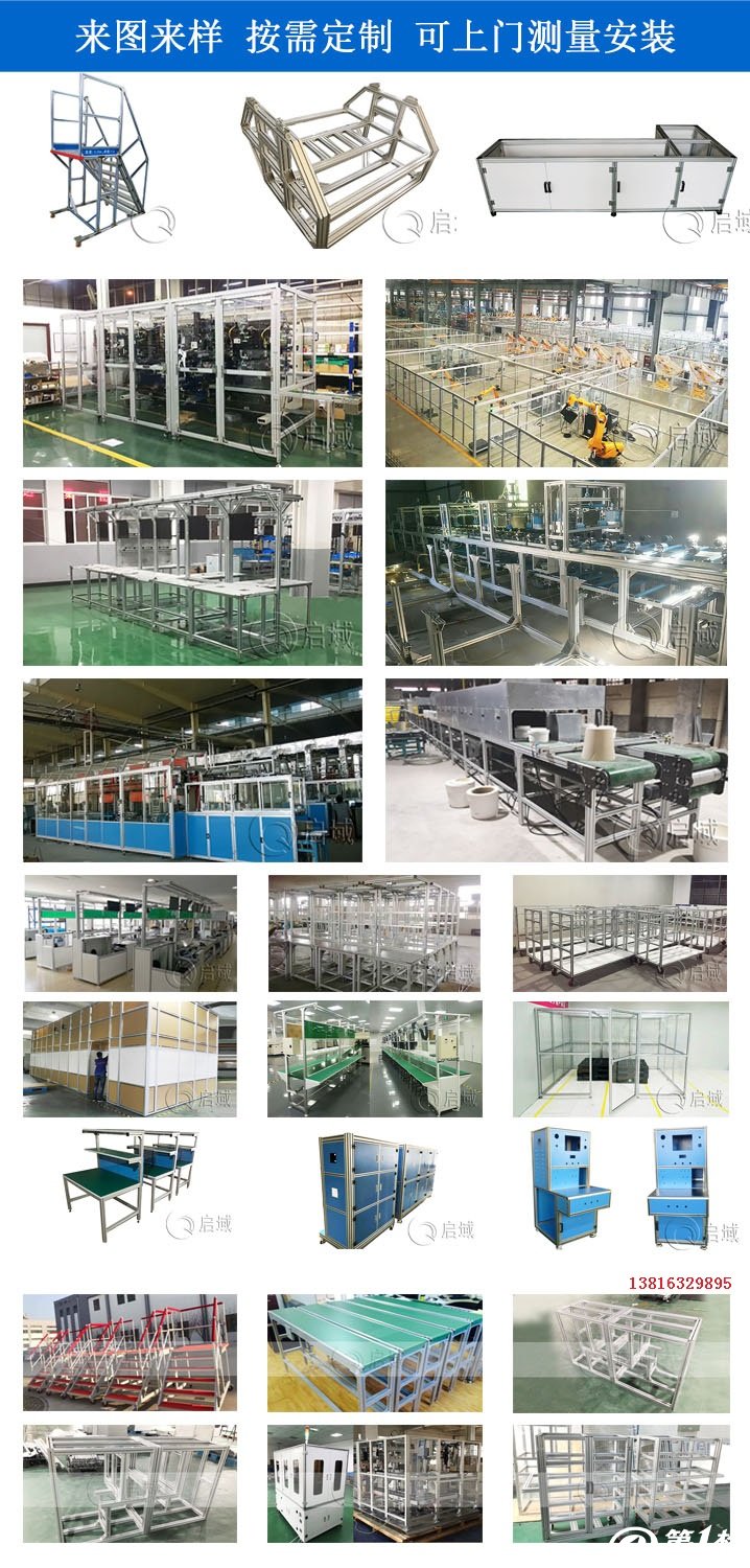 流水线工业铝型材及配件可以加工组装成产品:工具料架(车)、产品专用工具车、防静电工作台、产品展示架、液晶面板、阳光房、展示柜、展示架、机械防尘护罩、产品检测设备、非标设备、工业围栏、屏风、绘图仪、检测设备、生物实验设备、机架、贴标机、生产流水线、电机转子生产线、电子产品生产线、流水线工作台、设备防护屏障、液晶屏生产设备外罩、仪器设备台、物料架、洁净棚、超市信息栏架、汽车模型、隔断等及个性化框架加工。
