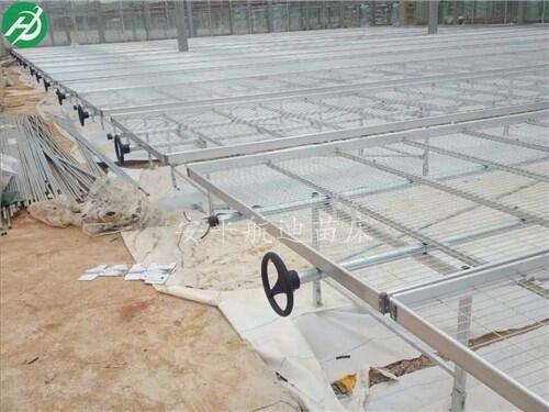 移动苗床床是由苗床网、滚动管、苗床支架、苗床边框、手轮、横支持、斜拉杆等组合而成。苗床通常高度为0.7m,上下能够进行稍微调整;通常宽度为1.5m,1.7m、1.8m、2m.实际尺寸依据温室实际宽度定做。长度依据用户需求定作,通常能够定在20-42m,苗床的长度不要超过42m,防止影响摇摆和使用效果。