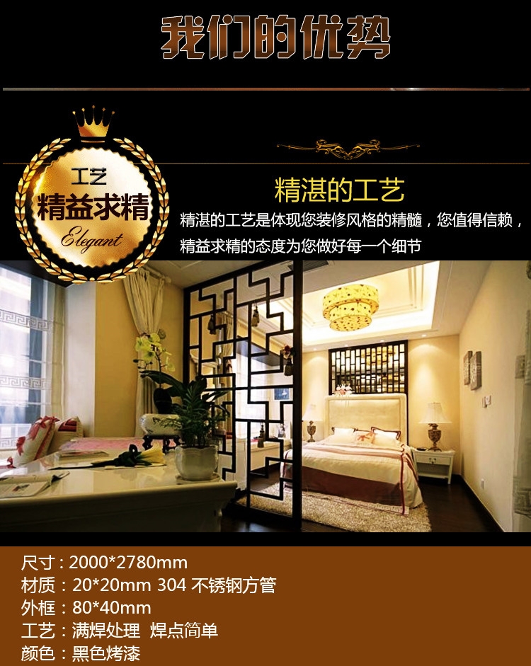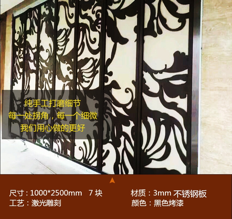 重置厅堂的秩序:合理隔断各个空间,兼并视角体验,让您的家变得井然有序。严格选材:安全稳固,整体采用高标铁艺管材,管壁加粗加厚,科学结构设计,具有安全稳固,不变形的特点。高温环保纳米烤漆:屏风表面进行高温高温烤漆处理后经磷化酸手工清洗。
