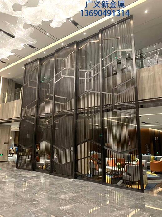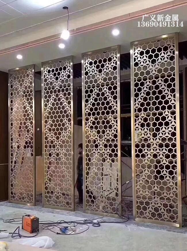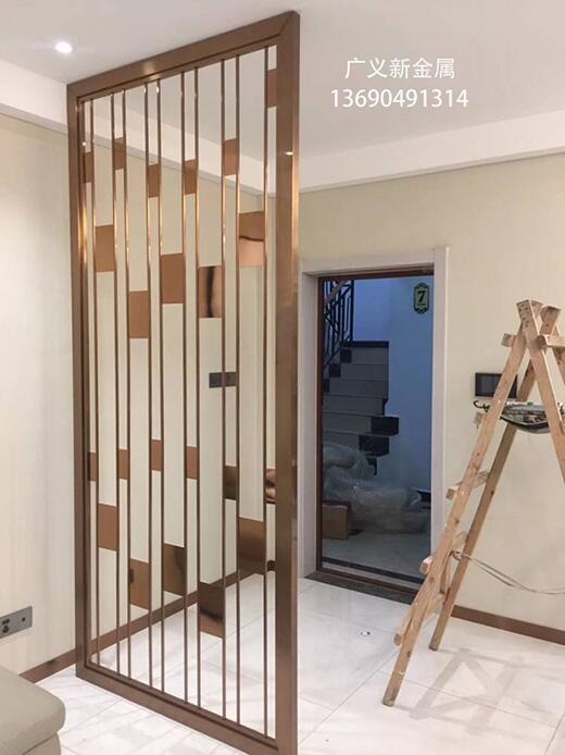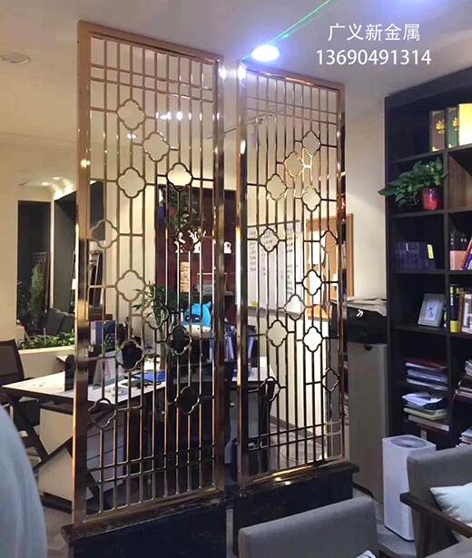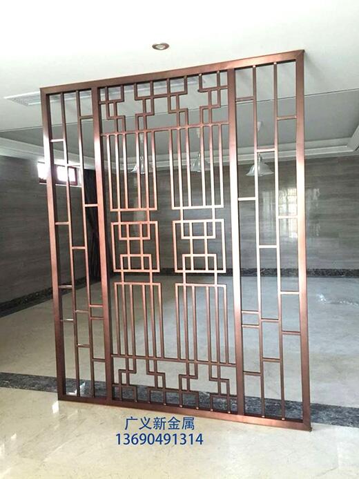 佛山广义新金属制品有限公司。专业提供不锈钢屏风、隔断不锈钢屏风、镂空不锈钢屏风、不锈钢酒店装饰屏风、客厅装饰屏风、家居屏风、会所不锈钢屏风等不锈钢屏风 隔断、镂空,来样设计加工,来图设计加工,可以有:玫瑰金、钛金、黑金、玫瑰红、古铜、香槟金等各种颜色,也可以来色板定制,颜色相似度90%以上。欢饮咨询.