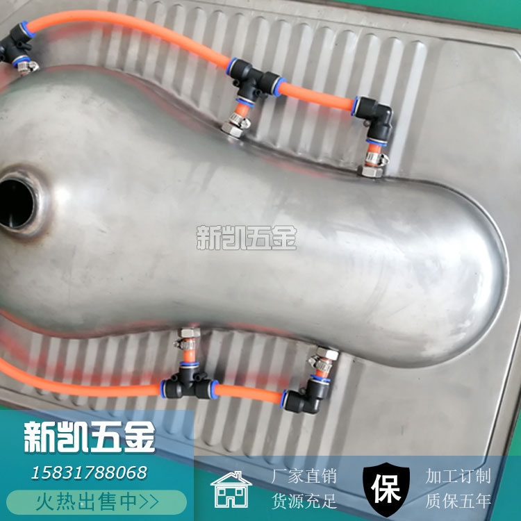 不锈钢一体式蹲便器是通过液压机一次性冲压成形,中间采用葫芦形轮廓,迎合人们蹲式入厕姿势合理,中部采用内凹设计,脚踏处并做条棱形防滑处理,防滑效果显著。