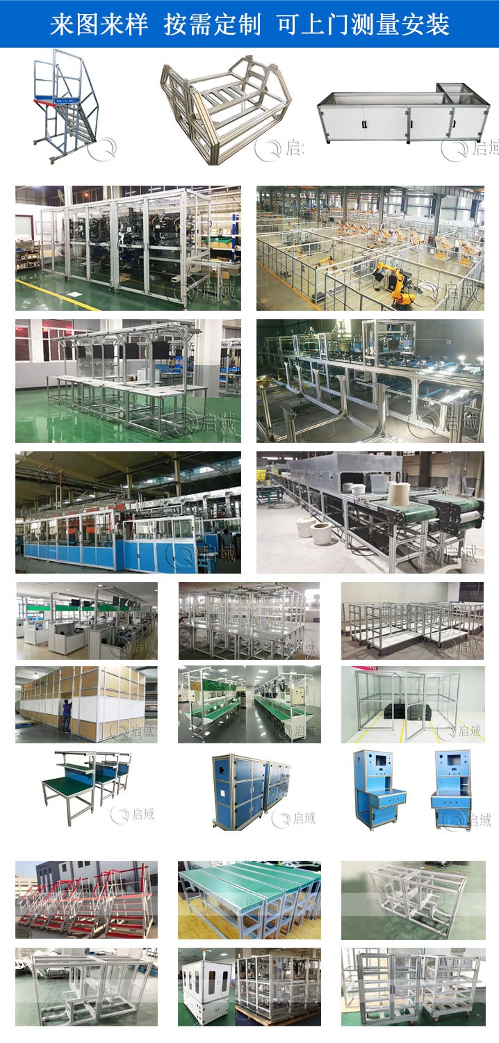 流水线工业铝型材及配件可以加工组装成产品:工具料架(车)、产品专用工具车、防静电工作台、产品展示架、液晶面板、阳光房、展示柜、展示架、机械防尘护罩、产品检测设备、非标设备、工业围栏、屏风、绘图仪、检测设备、生物实验设备、机架、贴标机、生产流水线、电机转子生产线、电子产品生产线、流水线工作台、设备防护屏障、液晶屏生产设备外罩、仪器设备台、物料架、洁净棚、超市信息栏架、汽车模型、隔断等及个性化框架加工。