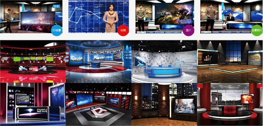 海量场景元素自由组合搭建,位置任意修改,一键保存,可搭建场景的3D高清虚拟演播室。 |