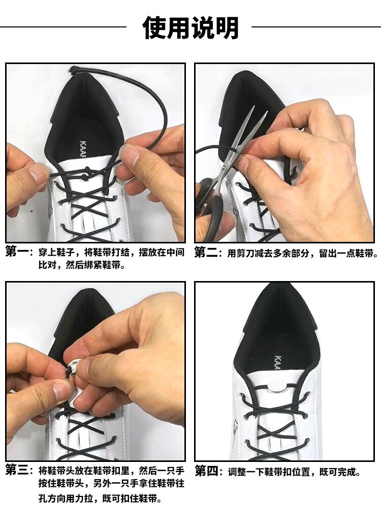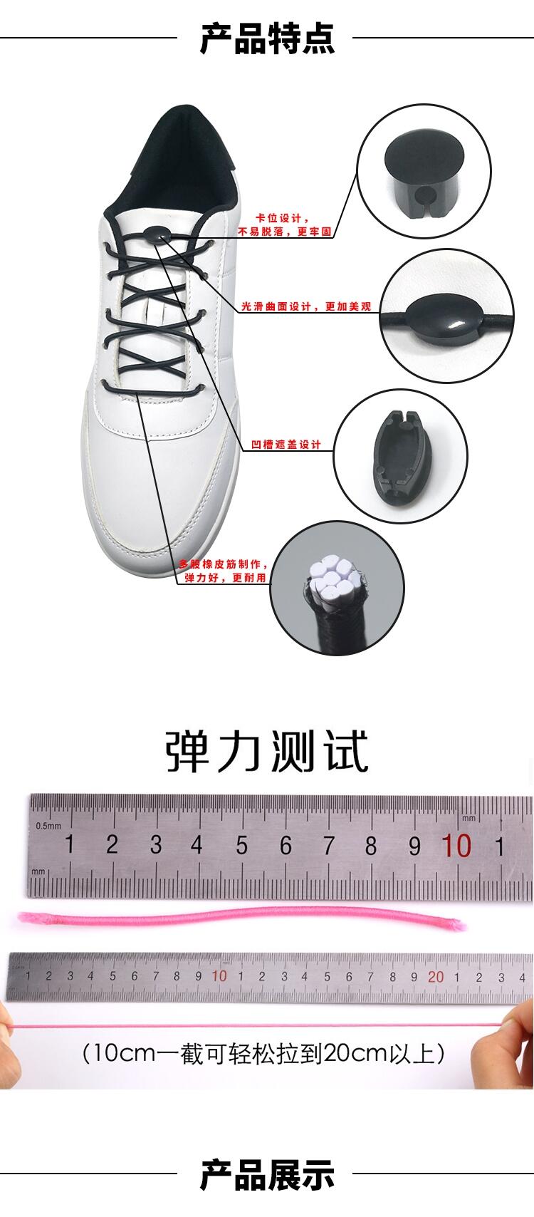 鞋带原理非常简单,就是把两边的鞋带分别穿进一根硅胶上。用的时候把鞋子穿好。另外,硅胶鞋带的弹性很强,。所以在剧烈运动如打篮球,鞋带也不会脱落。让人惊喜的是,这款产品不但穿鞋方便,拖鞋也很方便,只要把鞋跟固定脚背向上顶,还不会磨坏鞋帮内侧的布料。