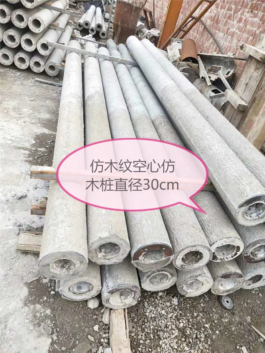 1.空心仿木桩以钢筋混凝土,螺纹钢筋为主要材料,采用模具混凝土浇筑工艺,在一次成型中形成凹凸的树皮,木纹效果,整体坚固耐用,表面纹路自然平滑。