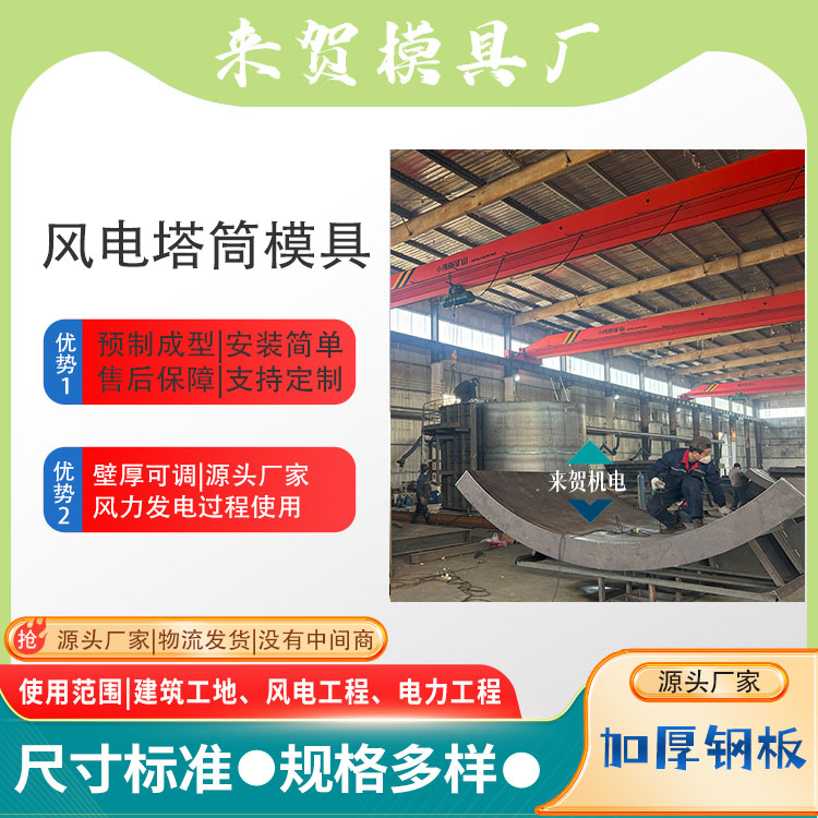 风电塔筒模具是依据塔筒制件要求设计的,根据塔筒制件不同的尺寸要求,塔筒模具由相应的标准块模具组成。风电塔筒模具的结构主要由底模、侧模板、端模板、上盖及其它相关零部件组成。