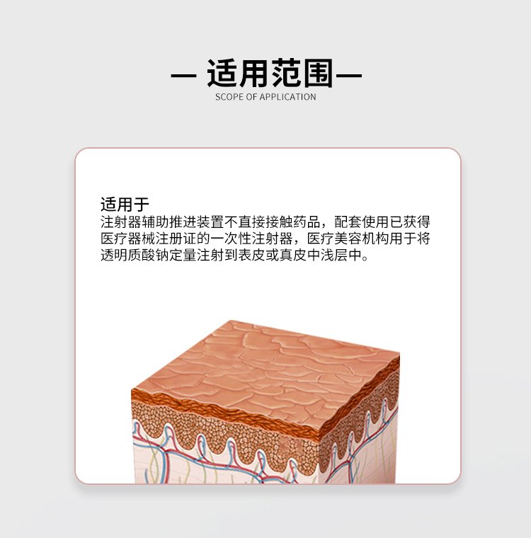 注射器辅助推进装置将透明质酸钠定量注射到表皮或真皮中浅层中