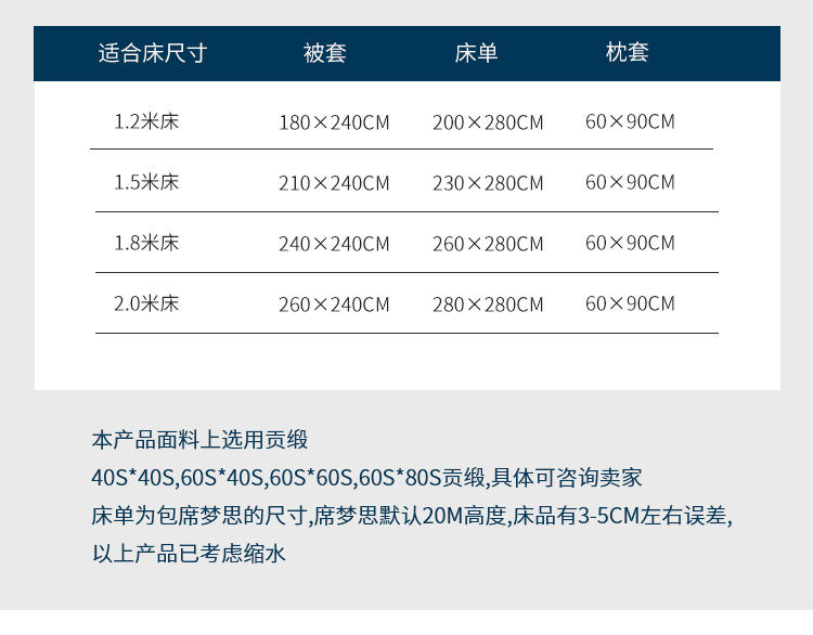 • 规格:全棉60s*60s双喷贡缎1.0m床单款三件套