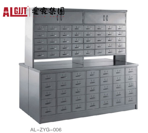 冷轧钢中药柜柜体采用用优质冷轧钢板精工制作,表面处理为聚能脂静电粉末喷涂(环保无毒害、无气味)。柜体可以颜色为经木红,浅灰色,一般中药柜每个小抽屉固定分成三格,可放一百多种中草药,有的下部抽屉可放较大药材,冷轧钢中药柜柜体内部全封闭,可防鼠、防潮、防串药,自制抽屉平导轨,推拉自如。