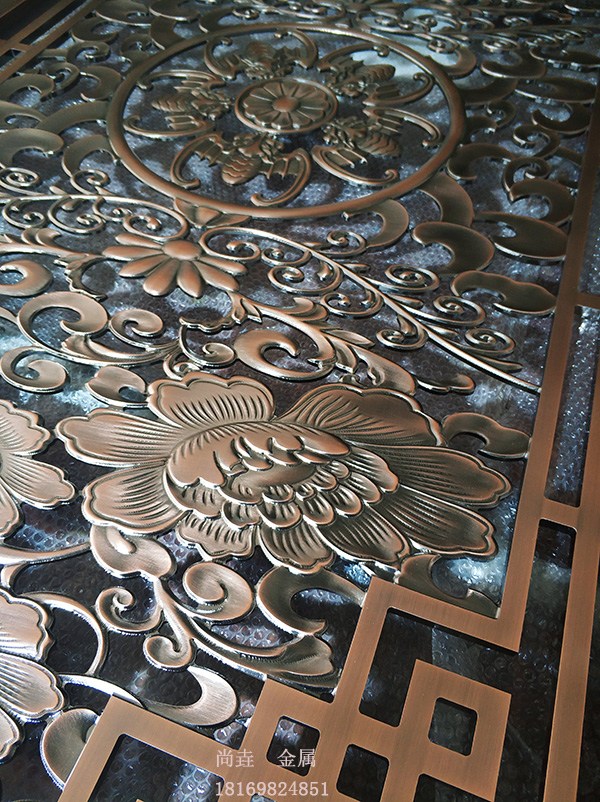 不锈钢屏风(花格)通常通过板材的剪板,激光,刨槽,折弯,焊接,精抛成型,电镀制作成为成品,部分产品使用不锈钢管焊接+抛光+电镀成型。表面效果可供客户需要选择砂光、发纹、镜面、钛金、玫瑰金、香槟金、仿古铜、青铜、红铜、黑钢等各种彩色不锈钢系列。