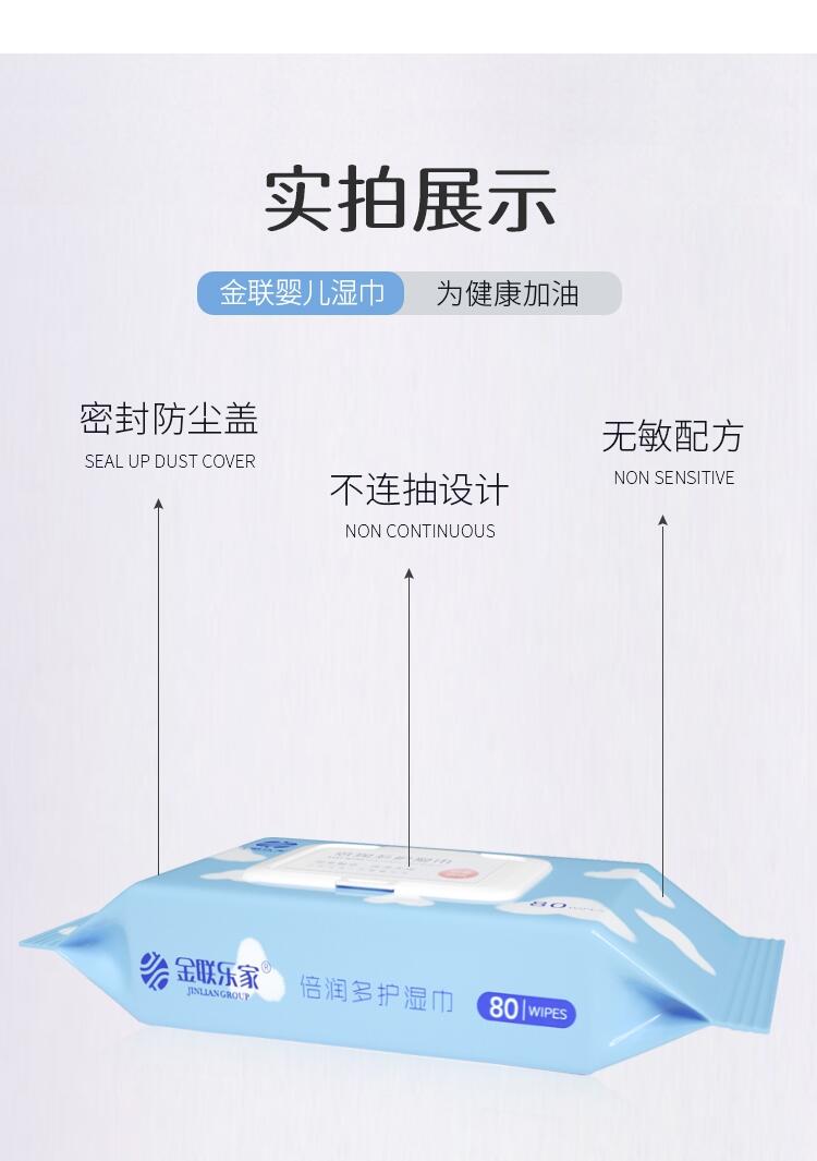 山东金联生活用品有限公司代工湿纸巾全棉湿巾代工,为什么换尿布需要用湿巾清理?因为清水一般为硬水,水中的氯和重金属会刺激宝宝皮肤导致宝宝不舒服,用婴儿湿巾,可以有效清洁宝宝PP,还能在宝宝肌肤形成天然的滋润保护层。
