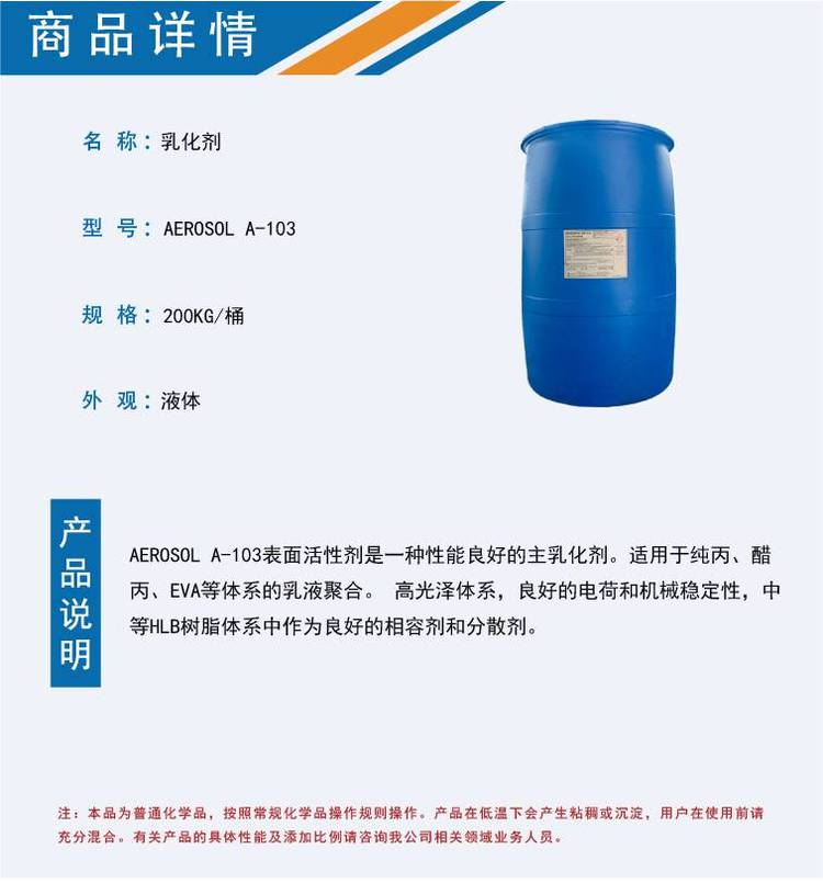 AEROSOL A-103表面活性剂是一种性能优异的主乳化剂。适用于纯丙、醋丙、苯丙和EVA等体系的乳