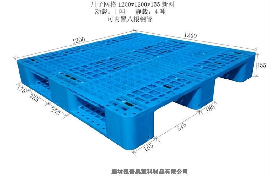 根据调查发现目前流通中的塑料托盘规格比较多。规格包括:1200x1000mm;1300x1100mm;1400x1100mm;1400x1200mm;1300x1000mm;1200x800mm;1200x1100mm;1100x1000mm;1100x1100mm;1100x900mm;1000x1000mm;1000x800mm;1200x1200mm 等几十种规格。其中相对比较集中的主要是1100x1100mm和1200x1000mm,约占塑料托盘的50%左右。塑料托盘生产中要使用注塑模具,而模具开发成本相对比较高。木质托盘的规格比较混,目前的规格主要是使用单位根据自己产品的规格定制,这与木质托盘制造工艺相对比较简单有关。钢制托盘的规格不是很多,集中在二至三个规格,主要用于港口码头等单位,它对于托盘的承载重量要求比较高。另外在调查中还发现,现在企业使用的托盘多为平面四向进叉双面,约占托盘使用总数的60%左右。其余的还有平面双向进叉双面使用托盘、单面用平式托盘、箱式托盘和柱式托盘。特种托盘的使用数量比较少。箱式托盘现多用于企业生产过程中的物料搬运,基本上不进入流通。塑料托盘价格较低,使用寿命长,耐酸碱耐腐蚀、防霉变等特点在各种托盘中塑料托盘以其超高的性价比颇受各行业的青睐。