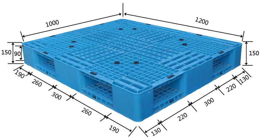 根据调查发现目前流通中的塑料托盘规格比较多。规格包括:1200x1000mm;1300x1100mm;1400x1100mm;1400x1200mm;1300x1000mm;1200x800mm;1200x1100mm;1100x1000mm;1100x1100mm;1100x900mm;1000x1000mm;1000x800mm;1200x1200mm 等几十种规格。其中相对比较集中的主要是1100x1100mm和1200x1000mm,约占塑料托盘的50%左右。塑料托盘生产中要使用注塑模具,而模具开发成本相对比较高。木质托盘的规格比较混,目前的规格主要是使用单位根据自己产品的规格定制,这与木质托盘制造工艺相对比较简单有关。钢制托盘的规格不是很多,集中在二至三个规格,主要用于港口码头等单位,它对于托盘的承载重量要求比较高。另外在调查中还发现,现在企业使用的托盘多为平面四向进叉双面,约占托盘使用总数的60%左右。其余的还有平面双向进叉双面使用托盘、单面用平式托盘、箱式托盘和柱式托盘。特种托盘的使用数量比较少。箱式托盘现多用于企业生产过程中的物料搬运,基本上不进入流通。塑料托盘价格较低,使用寿命长,耐酸碱耐腐蚀、防霉变等特点在各种托盘中塑料托盘以其超高的性价比颇受各行业的青睐。