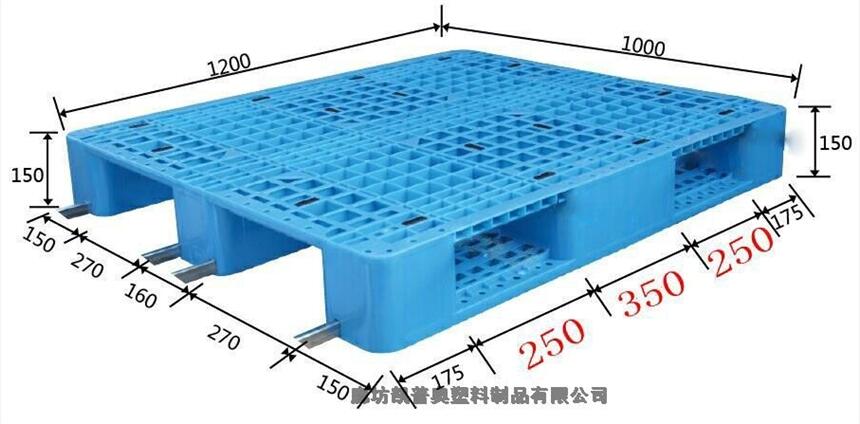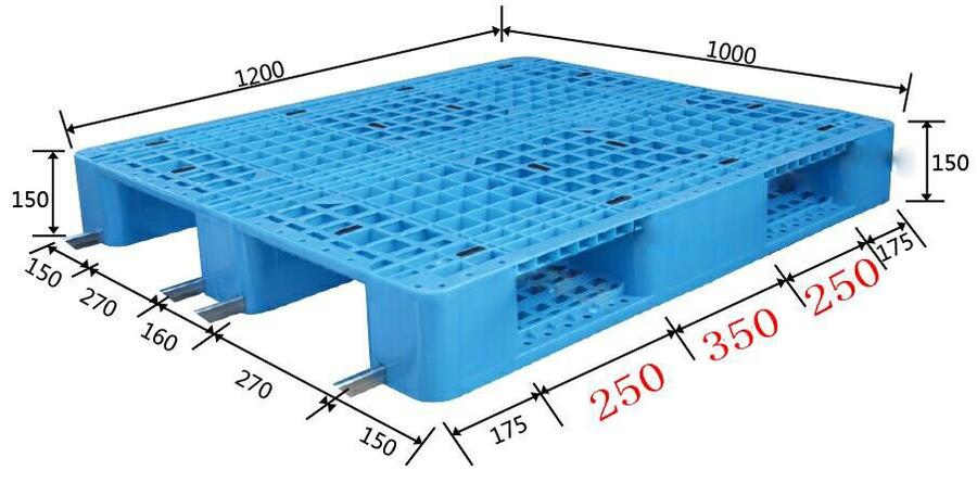 根据调查发现目前流通中的塑料托盘规格比较多。规格包括:1200x1000mm;1300x1100mm;1400x1100mm;1400x1200mm;1300x1000mm;1200x800mm;1200x1100mm;1100x1000mm;1100x1100mm;1100x900mm;1000x1000mm;1000x800mm;1200x1200mm 等几十种规格。其中相对比较集中的主要是1100x1100mm和1200x1000mm,约占塑料托盘的50%左右。塑料托盘生产中要使用注塑模具,而模具开发成本相对比较高。木质托盘的规格比较混,目前的规格主要是使用单位根据自己产品的规格定制,这与木质托盘制造工艺相对比较简单有关。钢制托盘的规格不是很多,集中在二至三个规格,主要用于港口码头等单位,它对于托盘的承载重量要求比较高。另外在调查中还发现,现在企业使用的托盘多为平面四向进叉双面,约占托盘使用总数的60%左右。其余的还有平面双向进叉双面使用托盘、单面用平式托盘、箱式托盘和柱式托盘。特种托盘的使用数量比较少。箱式托盘现多用于企业生产过程中的物料搬运,基本上不进入流通。塑料托盘价格较低,使用寿命长,耐酸碱耐腐蚀、防霉变等特点在各种托盘中塑料托盘以其超高的性价比颇受各行业的青睐。