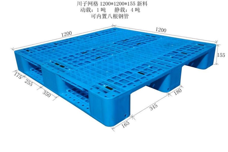 根据调查发现目前流通中的塑料托盘规格比较多。规格包括:1200x1000mm;1300x1100mm;1400x1100mm;1400x1200mm;1300x1000mm;1200x800mm;1200x1100mm;1100x1000mm;1100x1100mm;1100x900mm;1000x1000mm;1000x800mm;1200x1200mm 等几十种规格。其中相对比较集中的主要是1100x1100mm和1200x1000mm,约占塑料托盘的50%左右。塑料托盘生产中要使用注塑模具,而模具开发成本相对比较高。木质托盘的规格比较混,目前的规格主要是使用单位根据自己产品的规格定制,这与木质托盘制造工艺相对比较简单有关。钢制托盘的规格不是很多,集中在二至三个规格,主要用于港口码头等单位,它对于托盘的承载重量要求比较高。另外在调查中还发现,现在企业使用的托盘多为平面四向进叉双面,约占托盘使用总数的60%左右。其余的还有平面双向进叉双面使用托盘、单面用平式托盘、箱式托盘和柱式托盘。特种托盘的使用数量比较少。箱式托盘现多用于企业生产过程中的物料搬运,基本上不进入流通。塑料托盘价格较低,使用寿命长,耐酸碱耐腐蚀、防霉变等特点在各种托盘中塑料托盘以其超高的性价比颇受各行业的青睐。