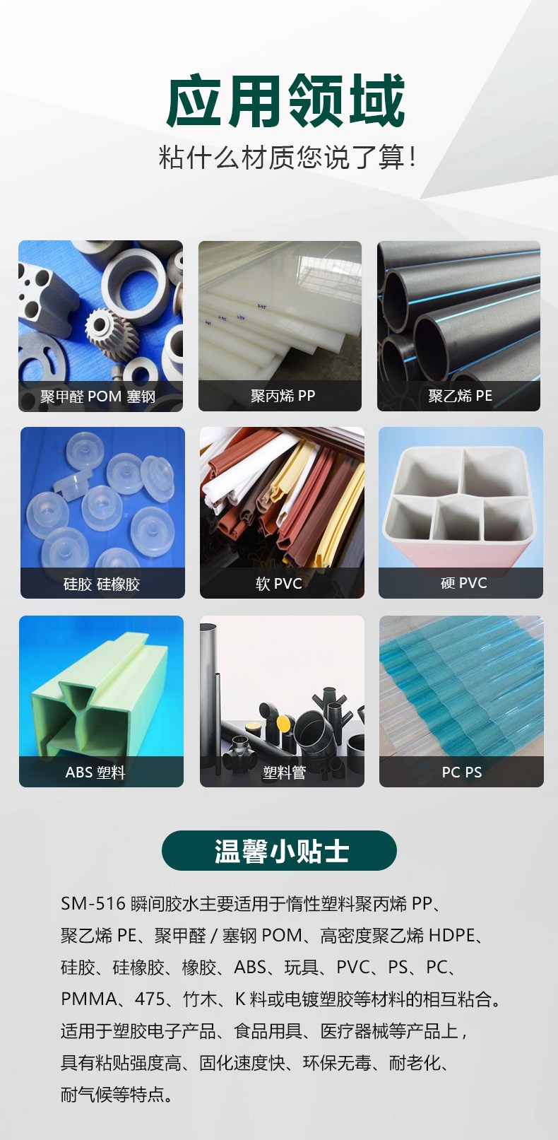 SM-516应用范围及特性:广泛用于POM,赛钢,聚甲醛之间粘接。