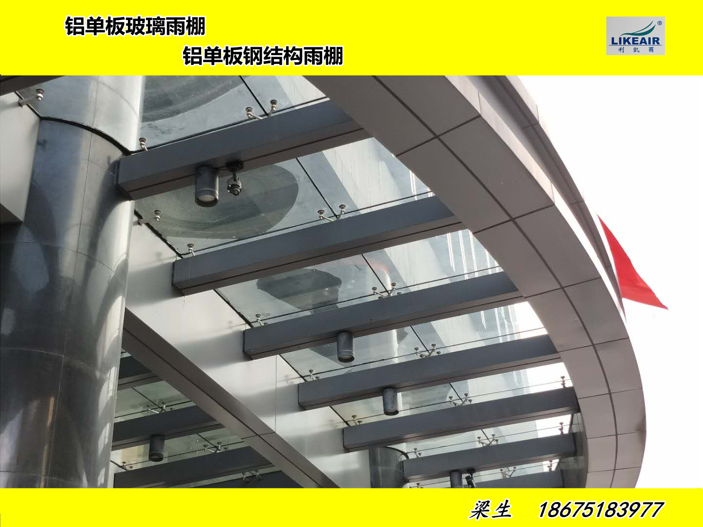 2、 雨棚铝板:主龙骨架以钢结构为主,顶部采用铝板和钢化夹胶玻璃,钢结构或铝合金永远不生锈,不变形,也不用担心高空有坠落物掉下砸坏铝板雨棚。
