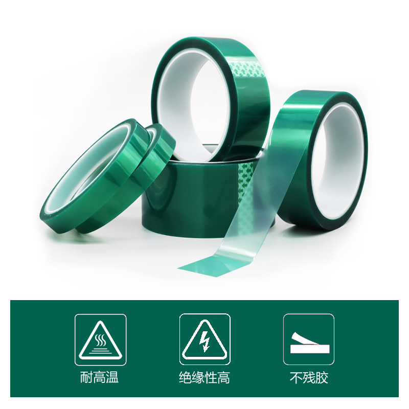PET绿色高温胶带产品详细信息: 绿色PET高温胶带主要用于喷涂烤漆电镀的遮蔽保护作用,耐温200度,时间为30分钟,耐酸碱、耐腐蚀、耐高压、不残胶。于电子产品、汽车行业、涂装等产品高温喷涂时遮蔽保护及绝缘等多种用途,高温胶带PET在制成后不留残胶。印刷电路板、电子零件、电阻电容器生产时固定;家电、机械、电子等行业需高温喷漆保护,高温捆绑固定作用。电路板波峰焊、回流焊或过锡炉时保护金手指部位,高温绿色PET胶带产品已通过SGS认证。