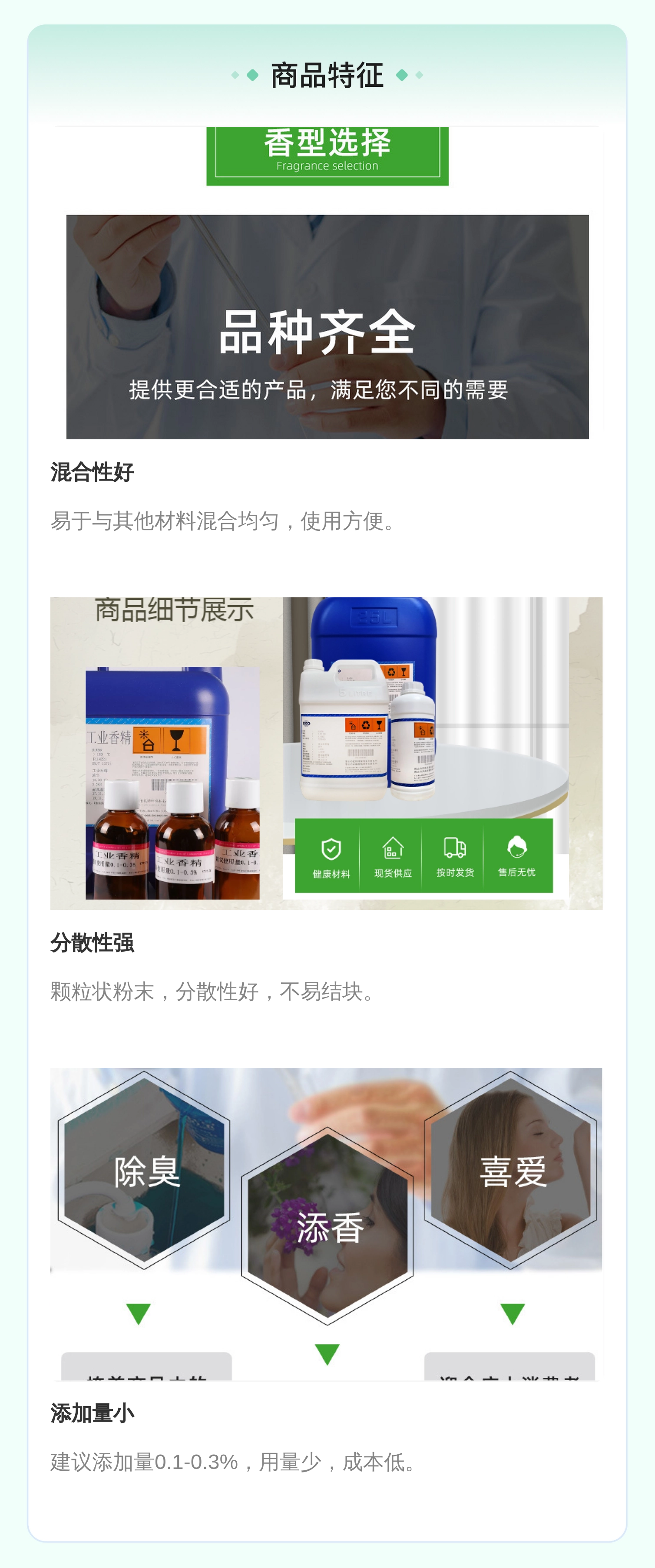 产品优点 | 掩盖难闻气味,提升产品体验 | ||