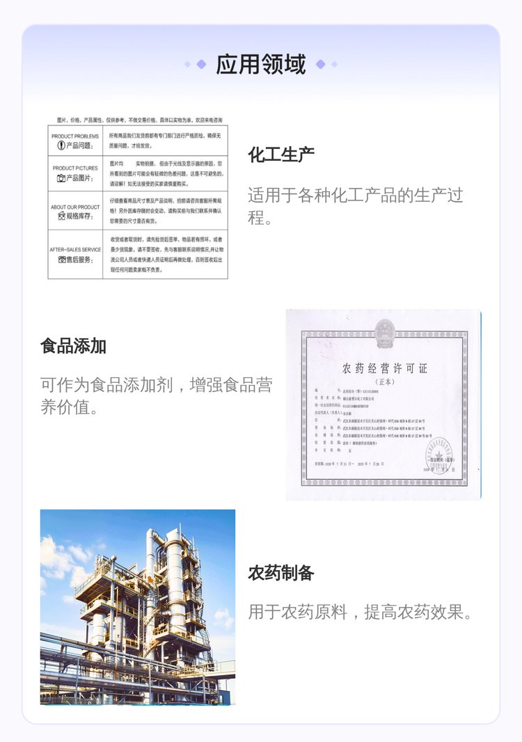 用途范围 | 化工原料、化工中间体、食品添加剂、农药原料等 | ||
