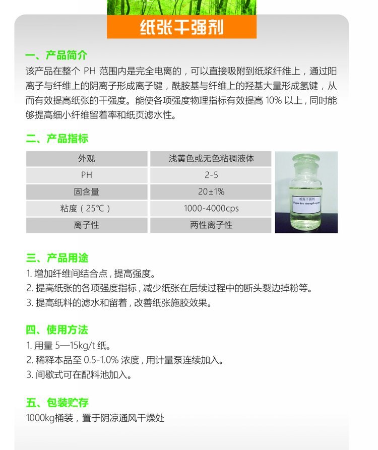 该产品在整个PH范围内是完全电离的,可以直接吸附到纸浆纤维上,通过阳离子与纤维上的阴离子形成离子键,酰胺基与纤维上的羟基大量形成氢键,从而有效提高纸张的干强度。能使各项强度物理指标有效提高10以上,同时能够提高细小纤维留着率和纸页滤水性。