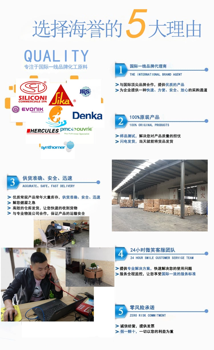 重庆海誉化工产品有限公司主要供应氯化锂、碳酸锂、聚羧酸减水剂、干粉消泡剂、有机硅憎水剂、石膏缓凝剂、低粘度纤维素、酒石酸、水泥缓凝剂、塑性膨胀剂、淀粉醚、触变润滑剂、湿润分散剂、减缩剂等建筑化工添加剂。主要用于堵漏王、自流平水泥、灌浆料、压浆剂、支座砂浆、EPS线条等特种砂浆里,公司本着质量为本、诚实守信、服务至上的销售理念,客户的满意就是我们的价值。