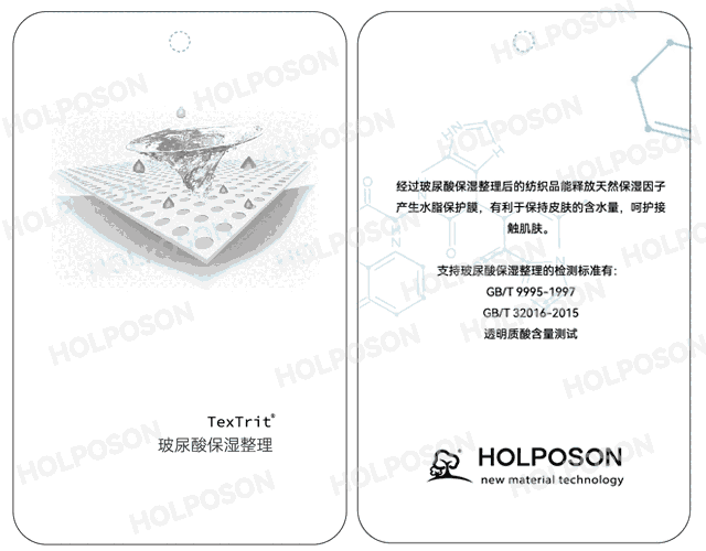 玻尿酸整理剂HOLPOSON® HYA-HYA适合纺织品后整理加工,有助于增加纺织品的保湿性能,经过玻尿酸整理剂整理的纺织品相较于未整理品,有更好的软糯手感,贴肤性更好,对人体的肌肤有良好的保护作用。也能使纺织品不易干燥起摩擦静电,是纺织品良好质感的品质伴侣。