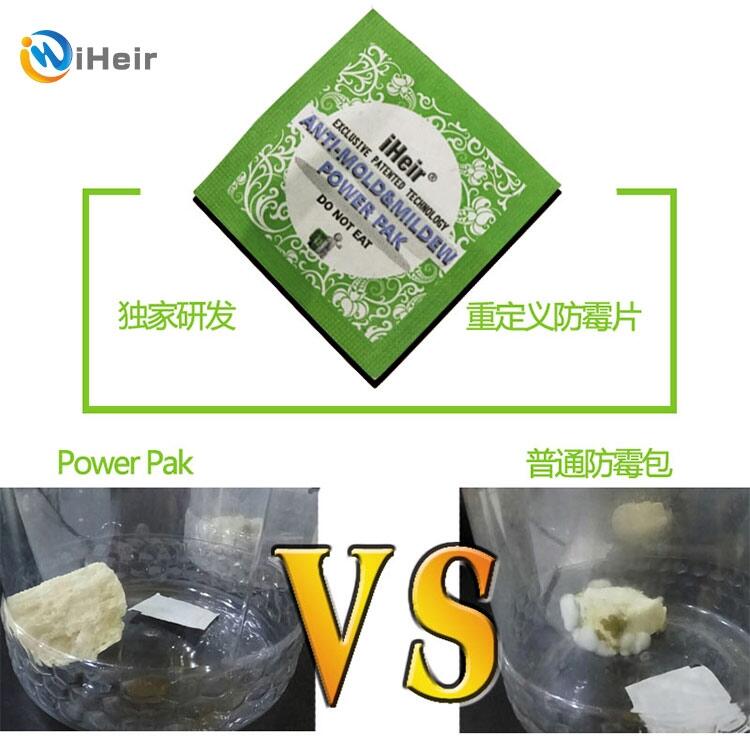 iHeir高效环保的 Power Pak防霉片是艾浩尔开发的高科技产品。已经在国内外申请多个项目的发明,Power Pak从山葵和芥末中提取的成分芥末精油做成的抗菌因子能够抑制霉菌和细菌的成长而且可以防止霉的繁殖,而且对小苍蝇等害虫有忌避效果。其防霉机理是常温升华将芥末油精做成的抗菌因子带到产品包装环境中,利用气体的流动平均分布于全部空间,从而杀死青霉、曲霉、球毛霉等霉菌,制造不利于霉菌生长的环境。在保护期内防霉效果非常明显。