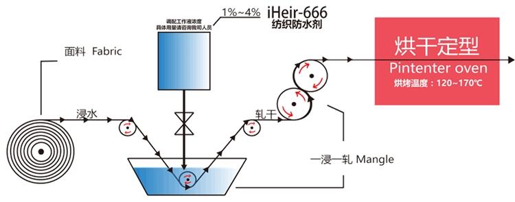 ◆ 与交联剂、渗透剂、防皱树脂及其它助剂同浴时,请预先测试这些助剂与iHeir-666的相容稳定性,并要求首先将这些产品和防水剂都分别稀释,避免原液相混合。