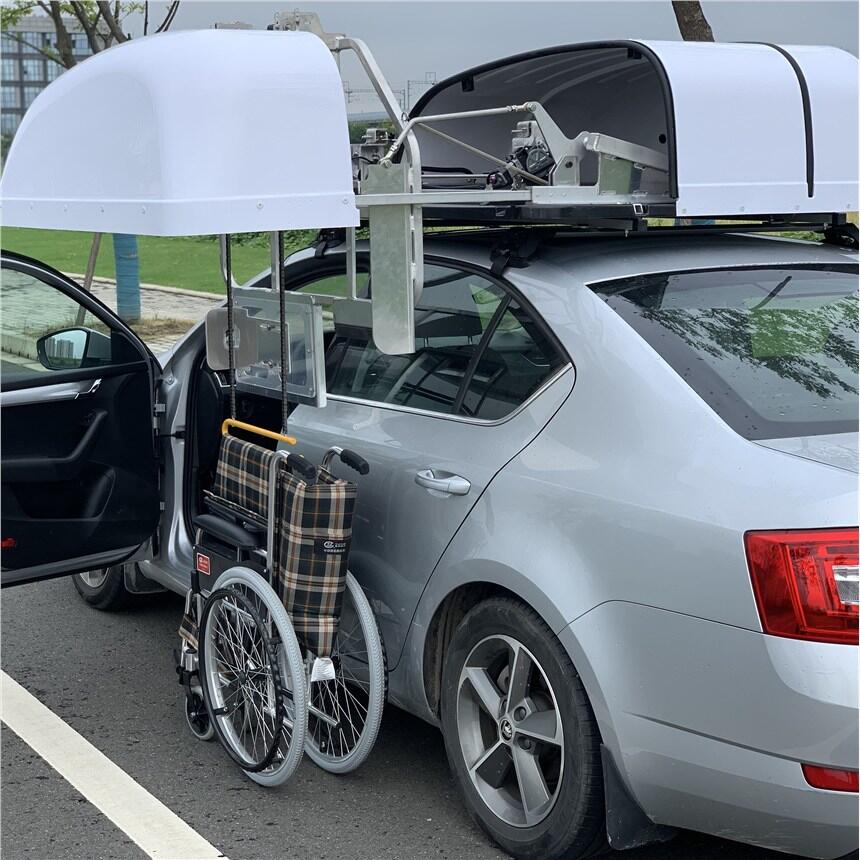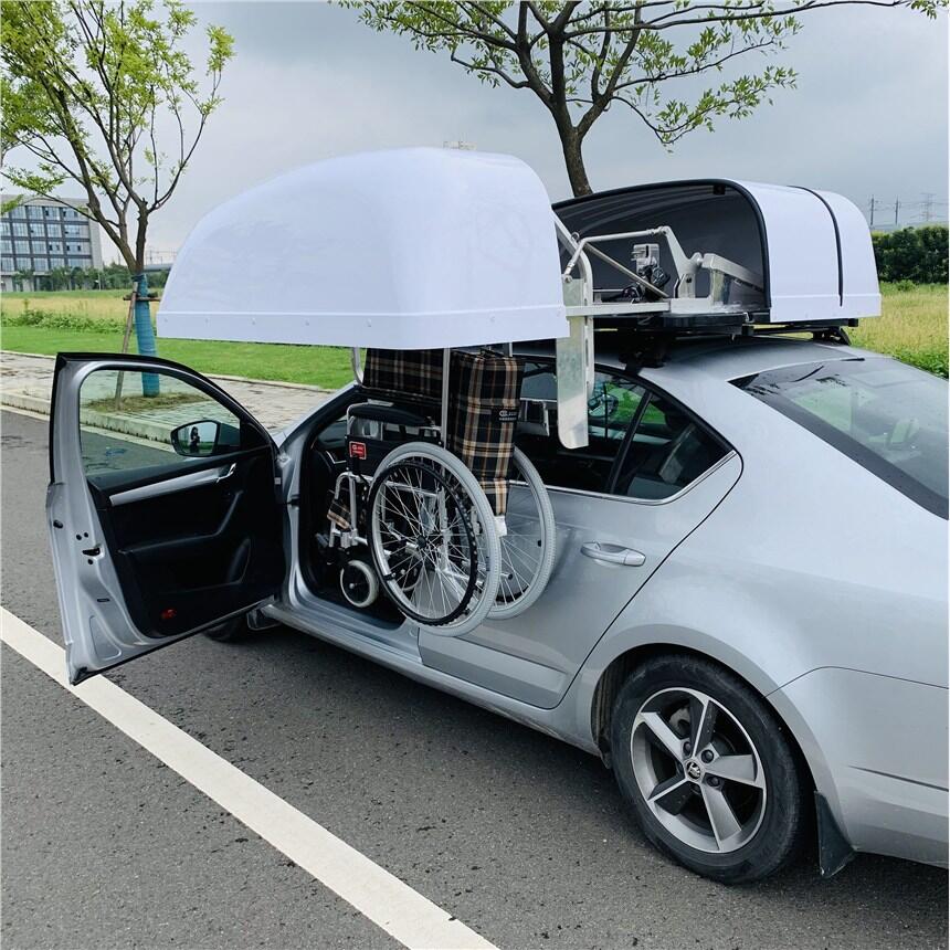 轮椅车顶收存装置为电驱动,可在30秒内将折叠式轮椅收存于车顶罩内,可用于残疾人自驾车。